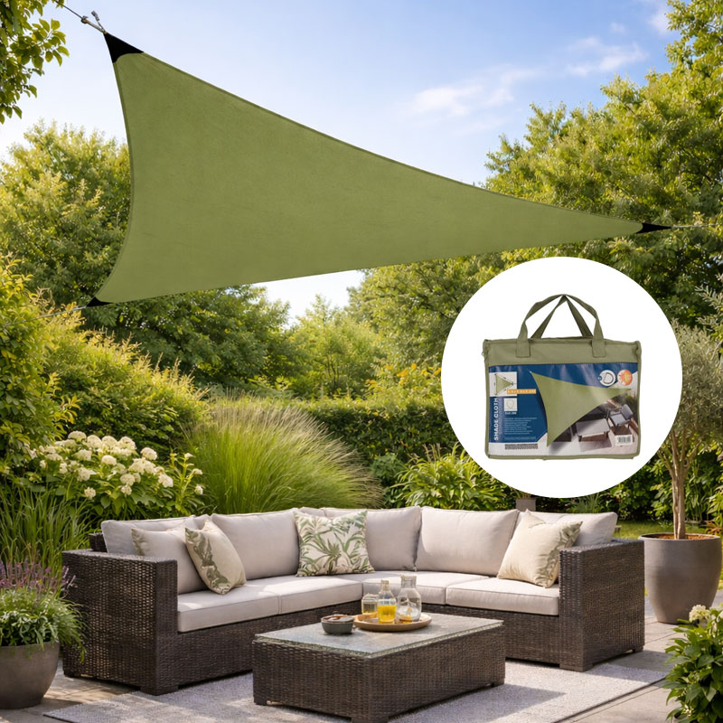 Zöld színű, háromszög alakú napvitorla, mely kifeszítve védelmet nyújt a nap ellen. Stílusos és nélkülözhetetlen kiegészítője bármely kertnek, ideális megoldás az erkély és a terasz árnyékolására, véd az UV sugaraktól.